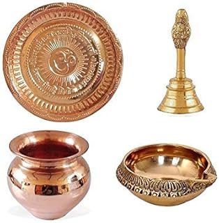 BRRL Brass Pooja Thali Set (Copper_Kuber Deepak: 2.5 Inch, Garuda Ganti Bell: 10 X 4 Cm, Thali: 6 Inch, Copper Lota: 4.88 Inch)