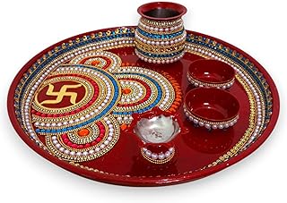 Satyanarayan Pooja KitRIA Studio Traditional Swastik Pooja Thali Set 12-Inch Stainless Steel Prayer Plate with Kundan Decoration 5-Piece Hindu Worship Kit (PO Red)
